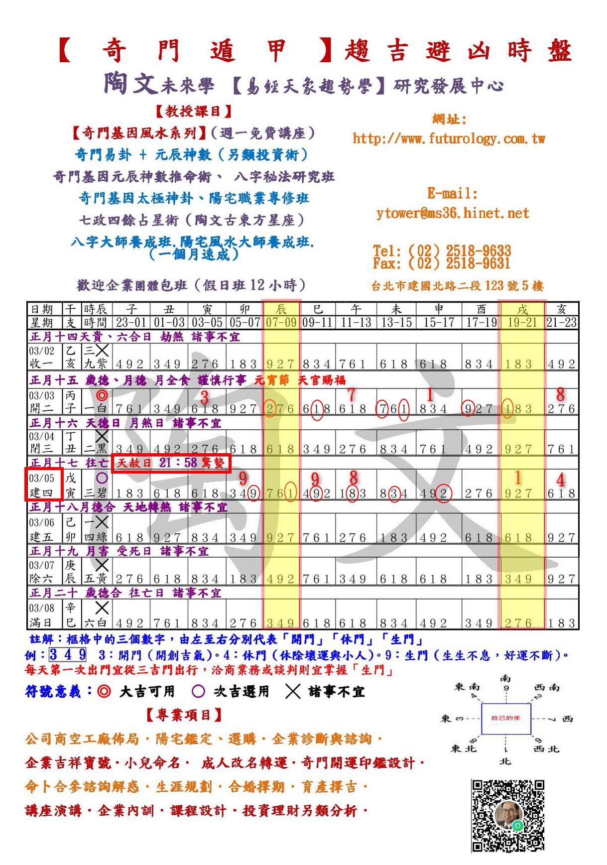 其餘時間的運用與風水開運布局,請自行參考「陶文未來學官網」【奇門遁甲】時盤。
